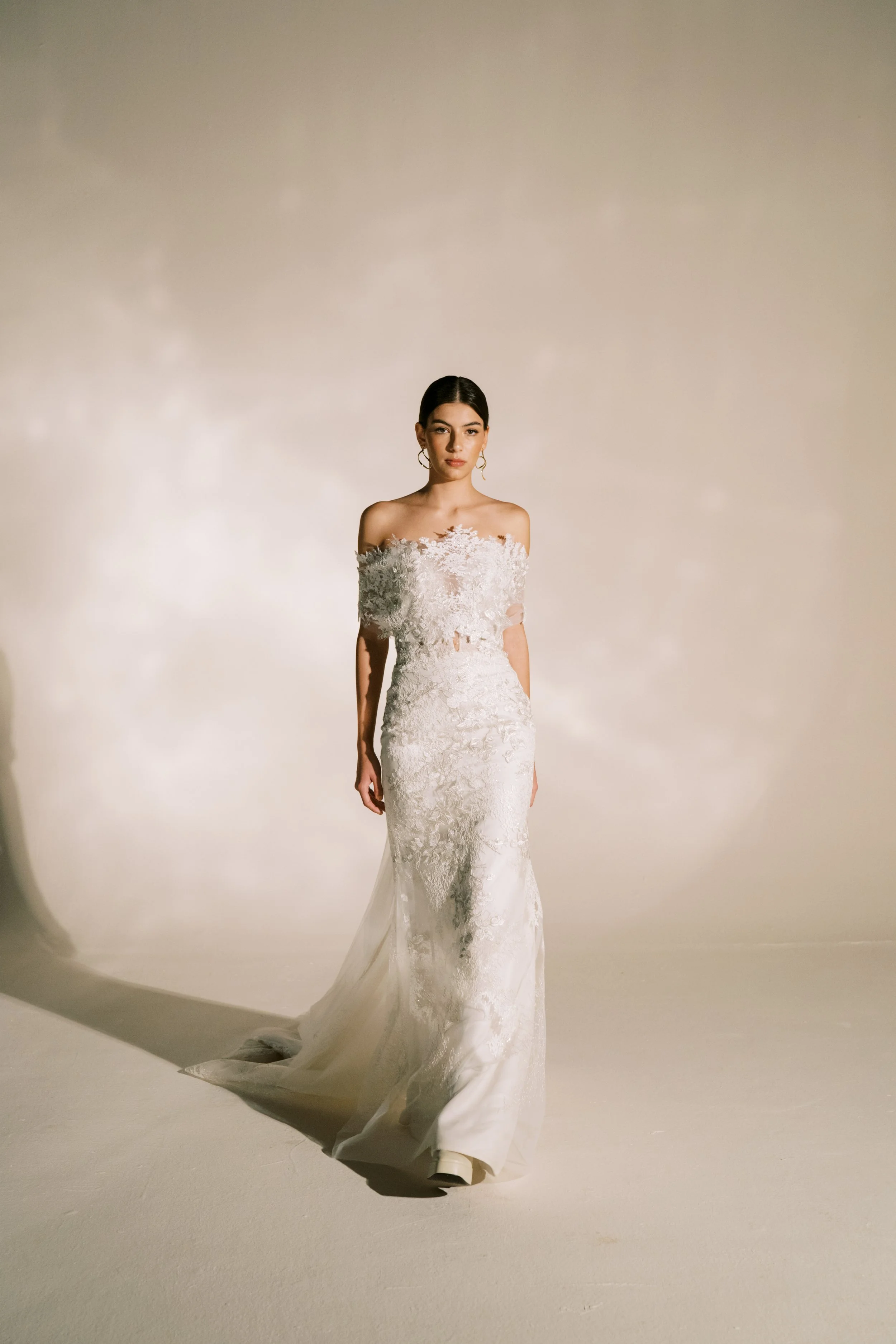 A mermaid-style gown featuring three-textured lace and a gracefully flowing long train.